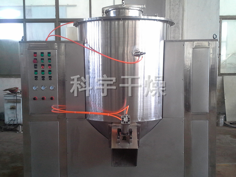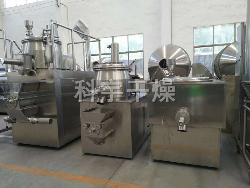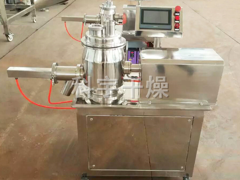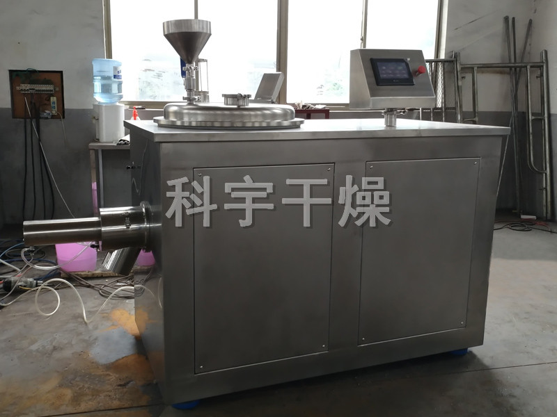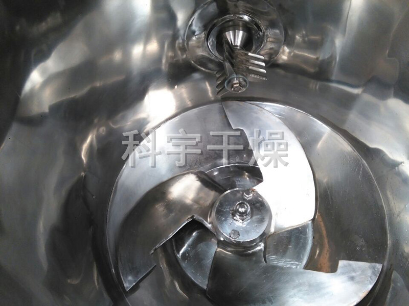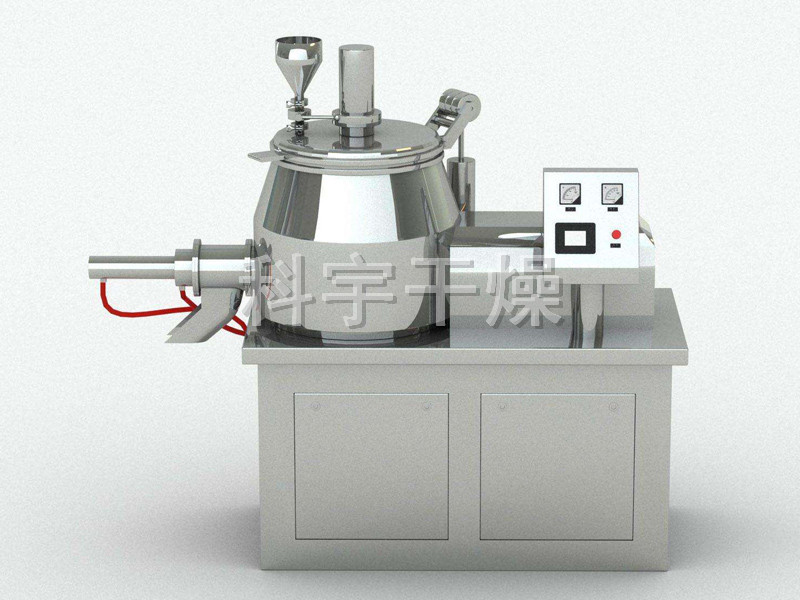 粉體物料與粘合劑在圓筒形容器中由底部混合漿充分混合成濕潤軟材,然后由側置的高速粉碎槳切割成均勻的濕顆粒。