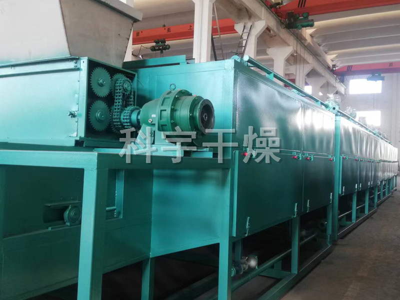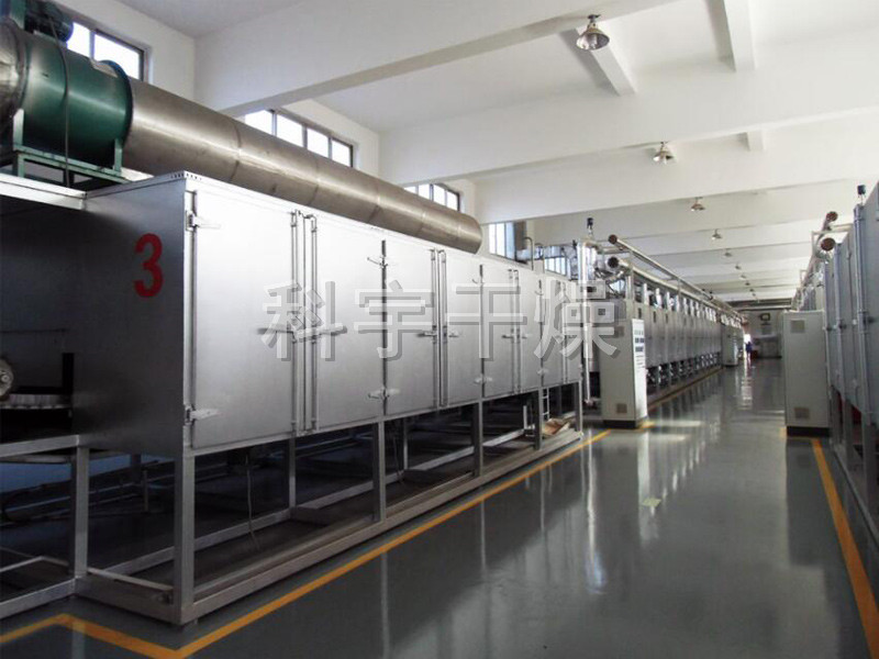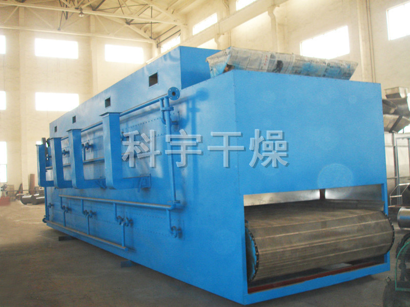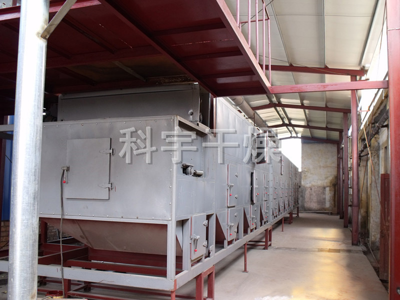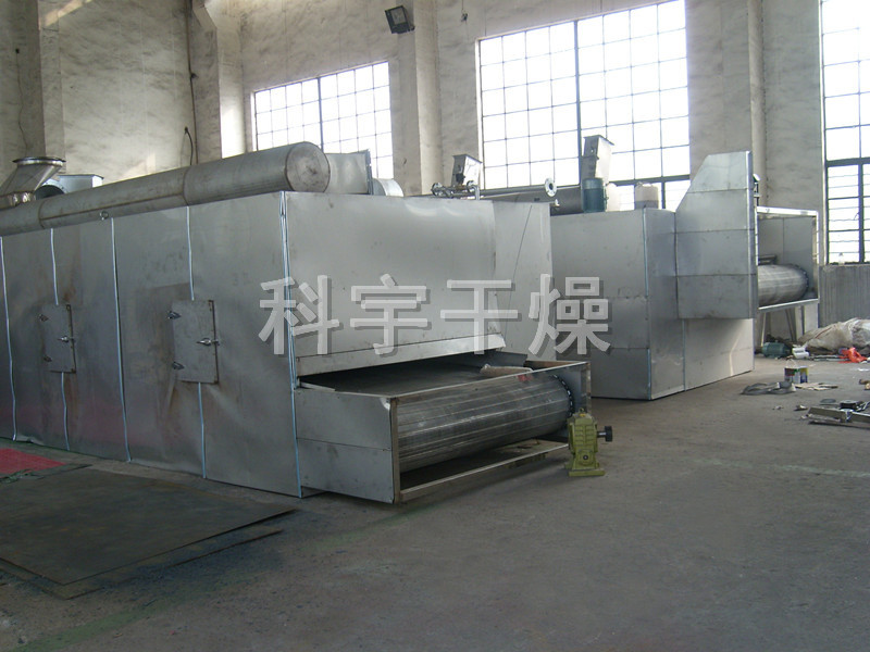 物料由加料器均勻地鋪在網(wǎng)帶上,網(wǎng)帶一般采用12-60目不銹鋼絲網(wǎng),由傳動(dòng)裝置拖動(dòng)在干燥機(jī)內(nèi)移動(dòng)。干燥機(jī)由若干單元組成,每一單元熱風(fēng)獨(dú)立循環(huán),部分尾氣由專門(mén)排濕風(fēng)機(jī)排出,廢氣由調(diào)節(jié)閥控制,熱氣由下往上或由上往下穿過(guò)鋪滿物料的網(wǎng)帶完成熱量與質(zhì)量傳遞的進(jìn)程,帶走物料水份。網(wǎng)帶緩慢移動(dòng),運(yùn)行速度可根據(jù)物料溫度自由調(diào)節(jié),干燥后的成品連續(xù)落入收料器中。上下循環(huán)單元根據(jù)用戶需要可靈活配備,單元數(shù)量亦可根據(jù)需要選取。